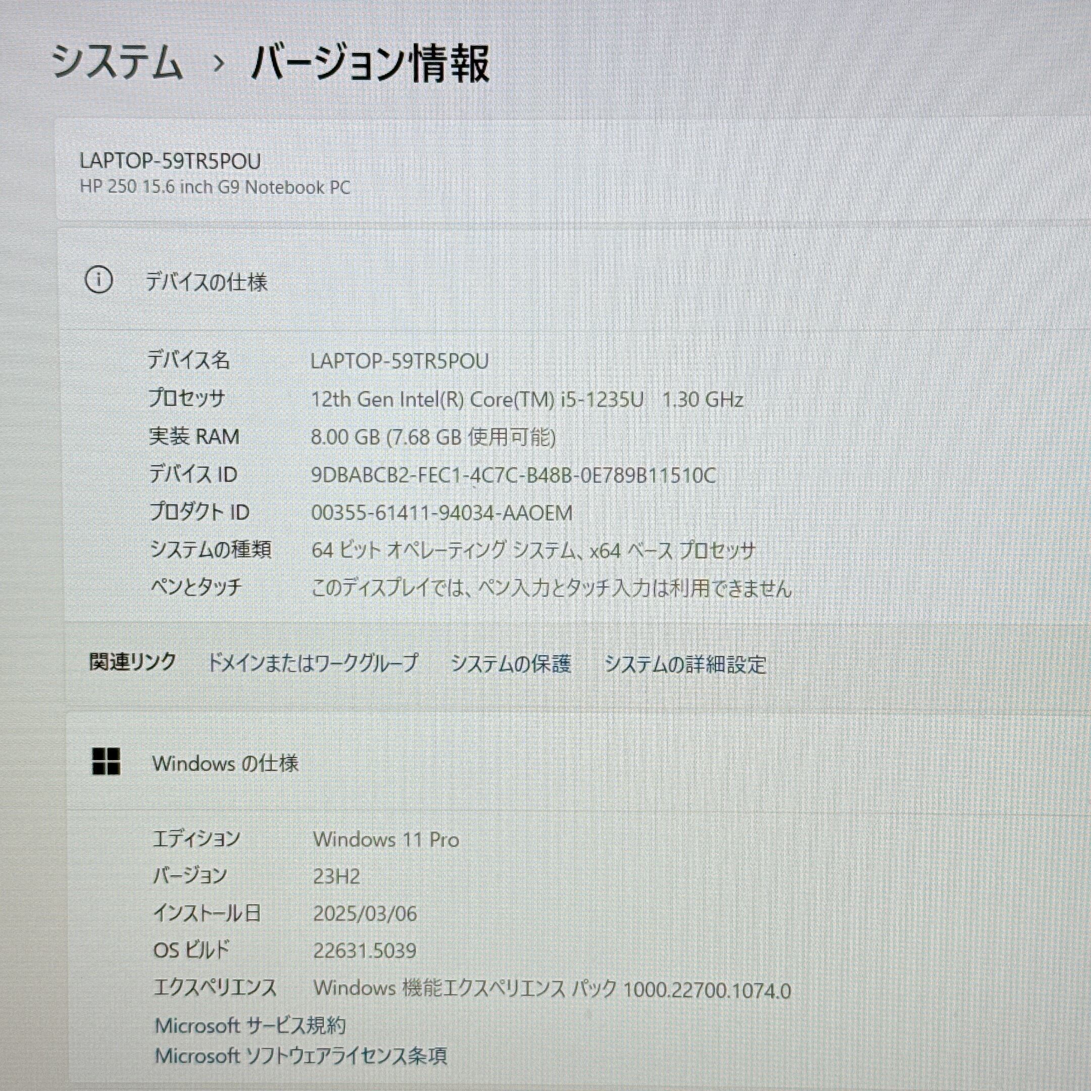 美品/ HP 250 G9 /最高峰i5第12世代/SSD256GB/ メモリ8GB/大型15.6インチ/人気ノートパソコン